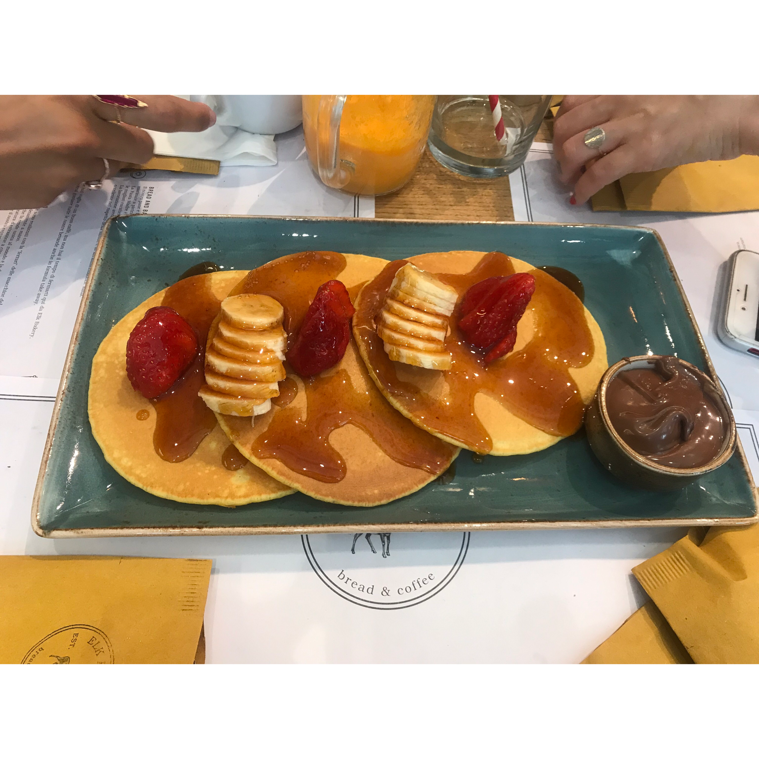 Since we are greedy bastards, we also decided to order pancakes to share and thank God we did, as it could have fed the whole of Verona! Tahani didn’t want bananas on her pancakes (weirdo) so I had the majority, whilst she went on a sugar overload of strawberries on pancakes with syrup and Nutella sauce.